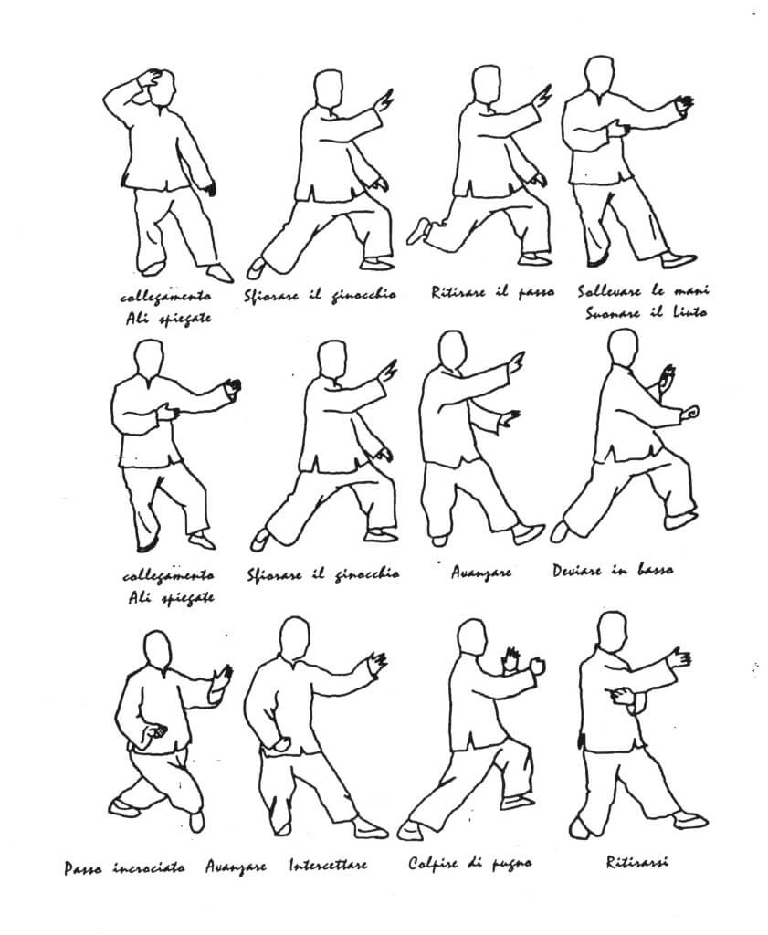 Nel Tai Chi si eseguono gli esercizi classici e alcune forme, poi si esegue la meditazione, poi esiste il Chi Chu che consiste nella posizione sempre in piedi dove si riequilibra tutto il corpo, e alla fine esistono le altre varie forme di combattimento veloce e lento lento…